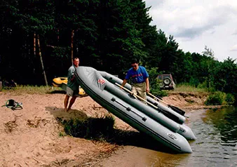 Мы спроектировали и начали серийный выпуск разборных лодок РИБ (стеклопластиковое дно + надувной баллон). Характерной особенностью и новизной был быстросъемный баллон, который крепился к пластиковому днищу по схеме «ликтрос/ликпаз». Такая простая конструкция позволяла пользователю практически в одиночку легко и быстро отсоединить баллон от днища, свернуть и убрать его, например, в багажник автомобиля, а габаритное и неразборное стеклопластиковое днище без труда (оно весило в пределах 40 кг) можно было разместить на верхнем багажнике легкового автомобиля, что не требовало использовать развесистые и не сильно распространенные тогда лодочные прицепы для перевозки лодки, а также существенно упрощало хранение такой лодки в межсезонье.